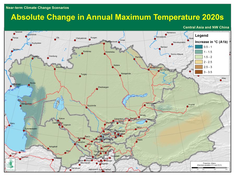 Central Asia and NW China absolute change of the annual maximum temperature 2020s_A1bV1