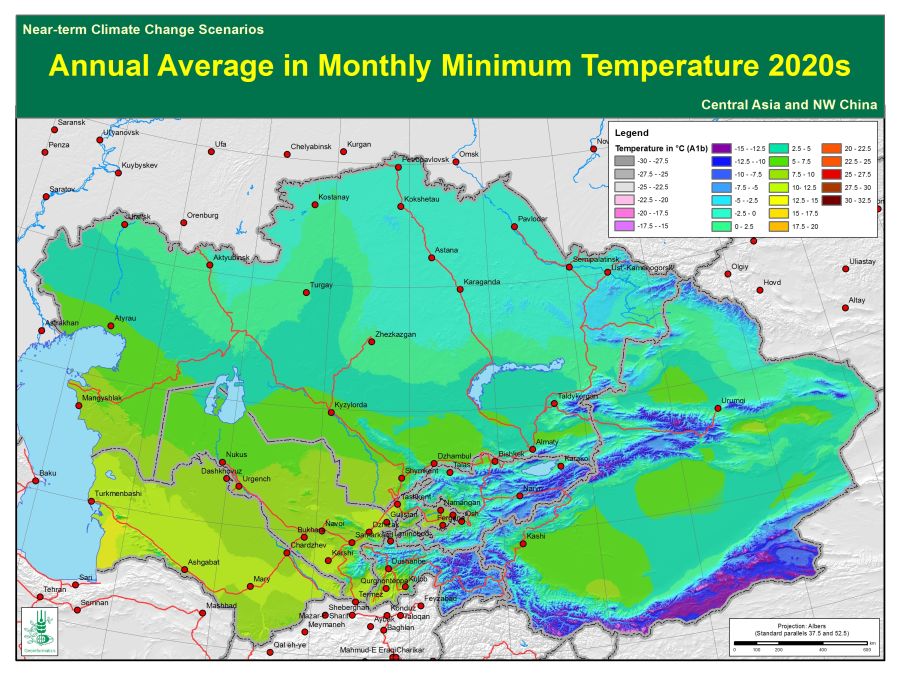 Central Asia and NW China Annual average of the monthly minimum temperature 2020s_A1bV1